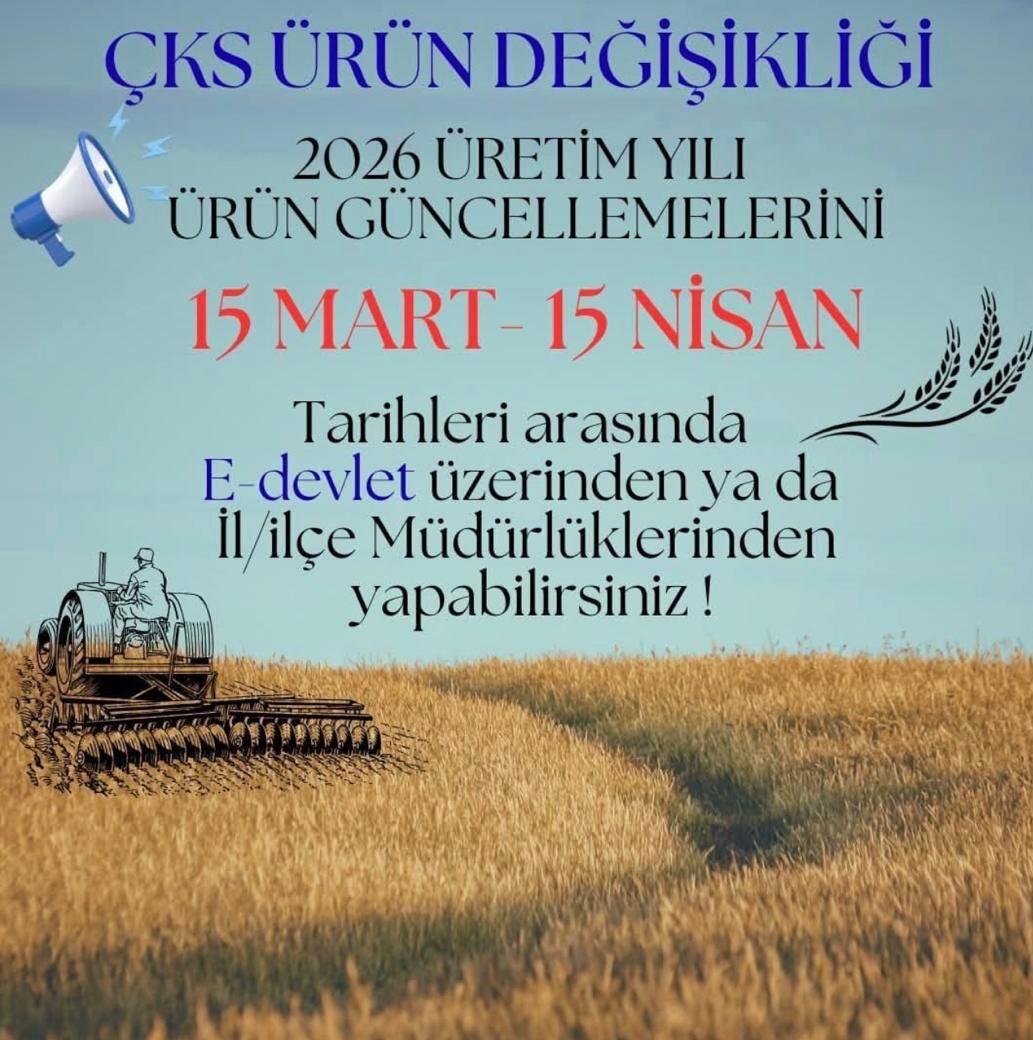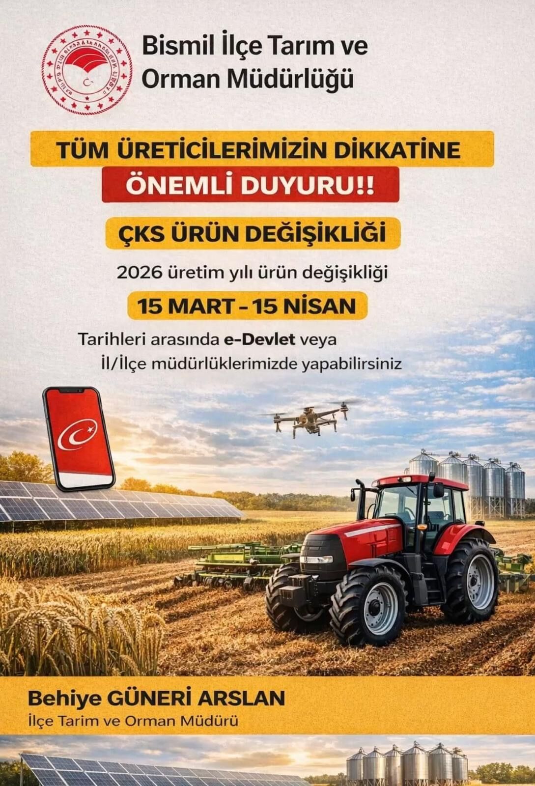 Bismil İlçe Tarım ve Orman Müdürü Behiye Güneri Arslan, Bismil habere yaptığı açıklamada, 2026 Çks kaydında beyan ettiğiniz ürün değişikliği talepleriniz 15 Mart - 15 Nisan Tarihleri arasında alınacaktır