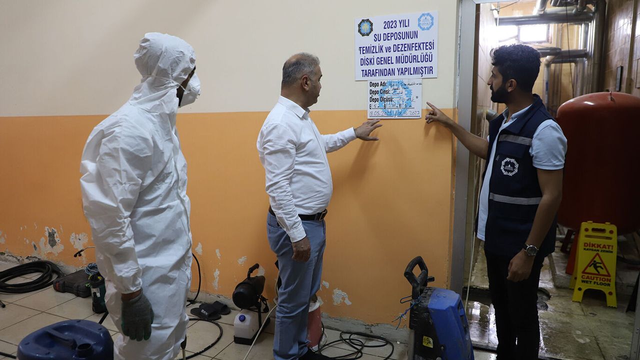 İçme Suyu Arıtma Tesisi'nde suyu arıttıktan sonra abonelerine yüksek kalitede ve sağlıklı bir şekilde ulaştıran DİSKİ Genel Müdürlüğü, mesken, bina, site, işyeri su depolarında suyun kirlenme ihtimalini önleme amacıyla su depolarında temizlik işlerini yürütüyor.