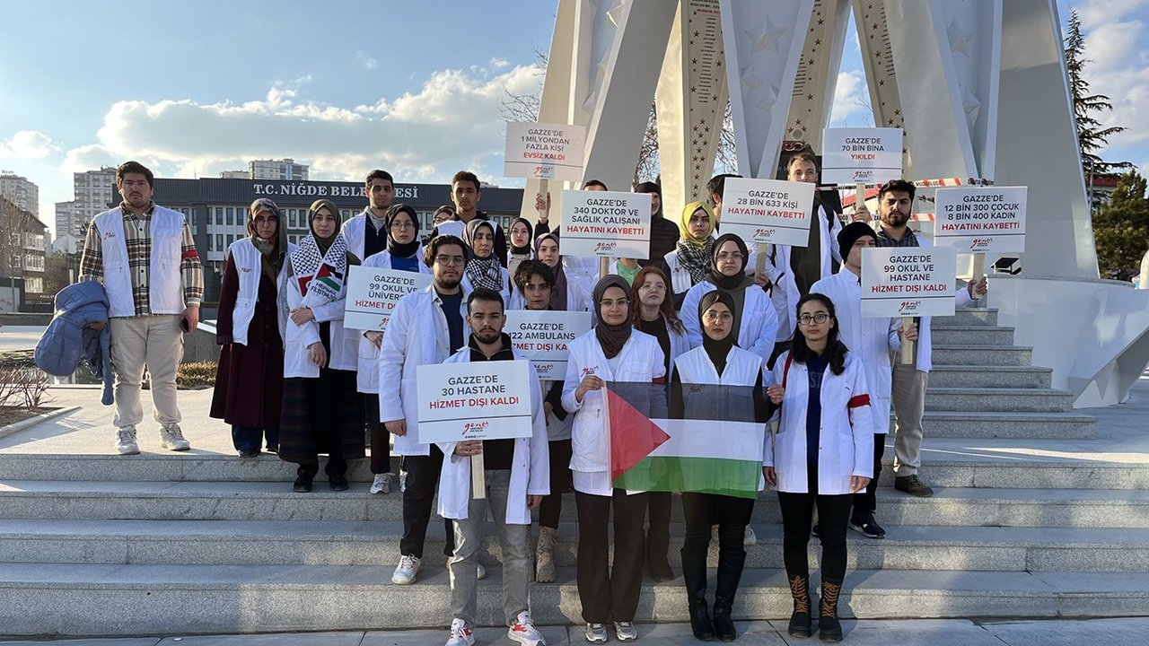 Üniversitelerin tıp, diş, eczacılık ve sağlık bilimleri fakültelerinde okuyan öğrenciler, Gazze'de yaşananlara kayıtsız kalmayarak gerçekleştirdiği "Gazze için Ses Ver" etkinliğinde insanlık dramına dikkat çekmek amacıyla ellerinde pankart ve dövizler taşıdı.
